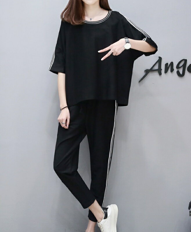 送料無料 セットアップ カットソー ロングパンツ 2点セット ジャージ レディース 女性 婦人服 大きいサイズ ゆったり ラフ ルームウェア 5分袖 Tシャツ ライン クルーネック トップス ボトムス 上下セット ポケット付き 単色 無地 部屋着 2XL