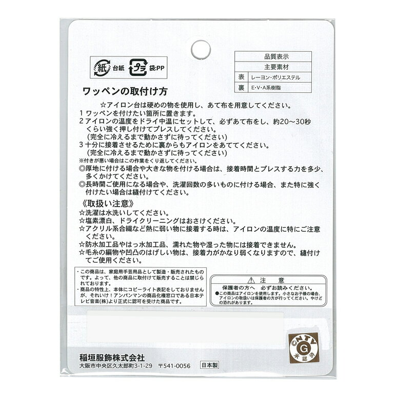 セット内容 ワッペン×1枚 商品サイズ ・ワッペン:約9.3cm×8.5cm・パッケージ:約14.5cm×11.2cm 材質 ・表/レーヨン・ポリエステル・裏/e・v・a系樹脂(エチレン・酢酸ビニル共重合樹脂) 製造国 日本 ワッペンの取り付け方 1:ワッペンを付けたい箇所に置きます。