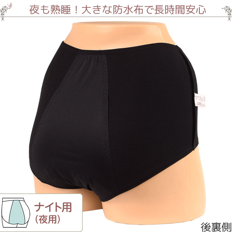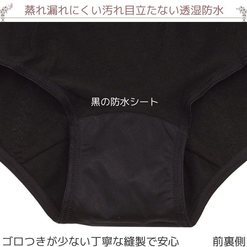 ナプキンの装着を失敗しても汚れ目立たない、黒の防水マチの 生理用ショーツ です。