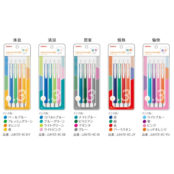 商品名ゼブラ ZEBRA サラサナノ 0.3mm 4色パック × 5種 セット説明ペンの上部にスプリングを加えた『うるふわクッション』を採用しました。