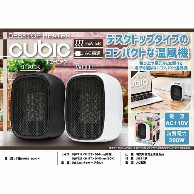 「温風機」DESKTOP HEATER cubic -キュービック- 【DESKTOP HEATER cubic -キュービック-】 デスクトップタイプのコンパクトな温風機 机の上や足元などに置ける、場所を選ばないコンパクト温風機 本体サイズ:約W112×H153×D90mm 外箱サイズ:約W127×H177×D105mm 重量:約522g(パッケージ含む) 仕様:電気用品安全法適合品 素材:ABS/鉄 電源:AC電源(110V) 消費電力:500W メーカー 株式会社Linx TEL 0120-96-8854 注意事項 メーカー都合にてパッケージ、デザイン、仕様変更等ある場合があります メーカー保証のあるものはメーカーの保証書付となります 輸入雑貨等メーカー保証の無いものに関しましても、 当社にて初期不良保証をお付けいたします。
