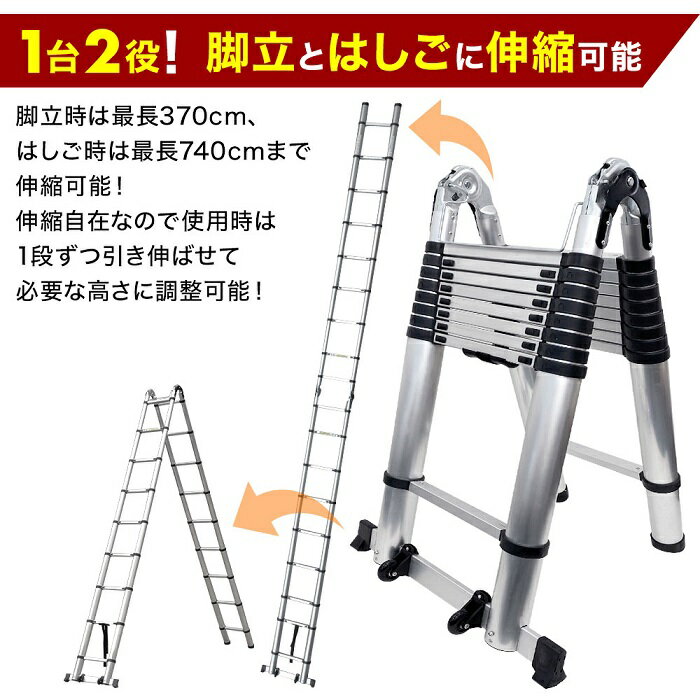 【1台2役!脚立とはしごに自由自在に伸縮可能】 脚立時は最長370cm、はしご時は最長740cm まで伸縮可能! 伸縮自在なので使用時は1段ずつ引き伸ばせて 必要な高さに調整可能! 【コンパクト収納で持ち運べるサイズ】 収納時はコンパクトになるので、軽自動車や玄関、 物置などの狭いスペースにもスッキリ収納できます。