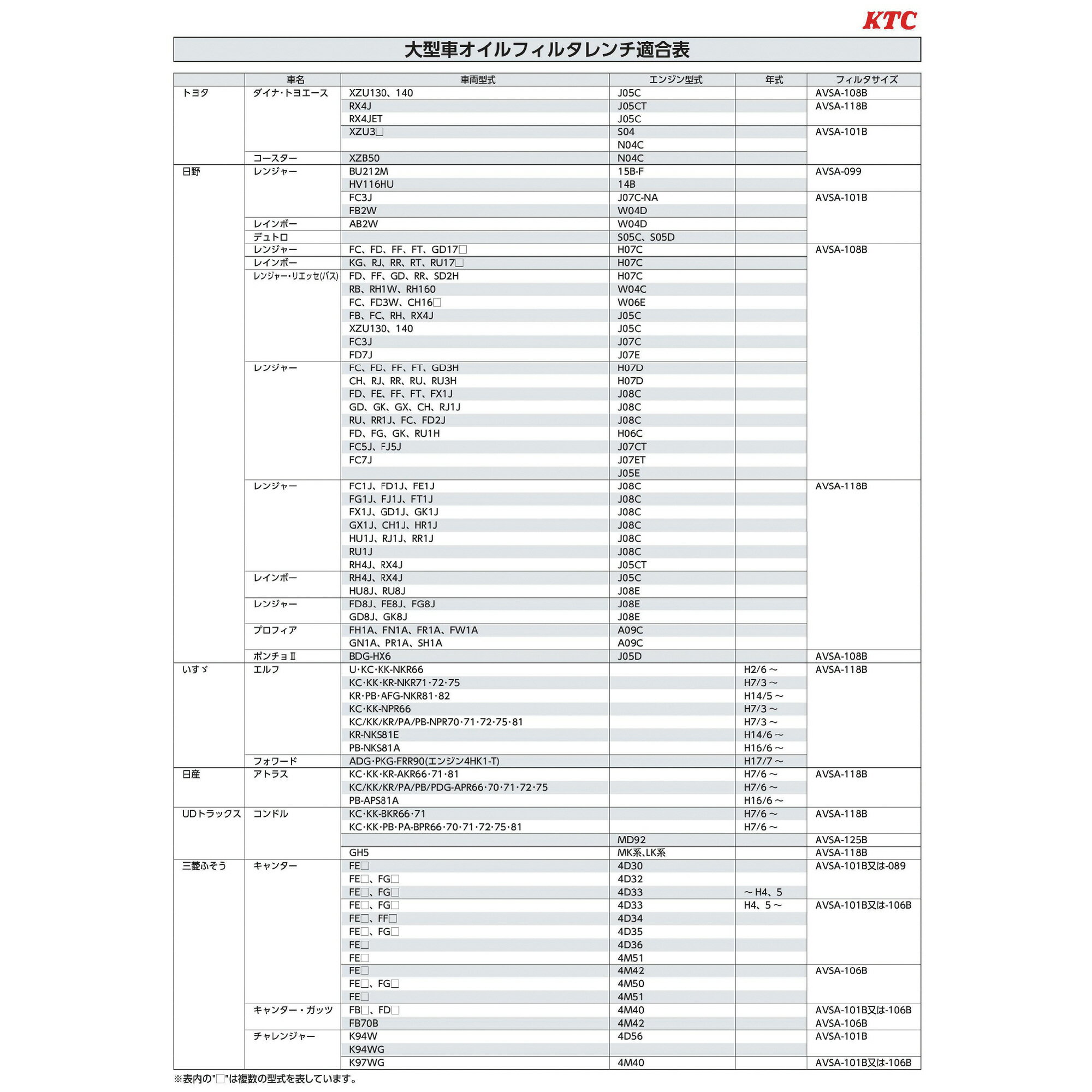 ●エンジン型式、三菱(4M40 (デリカスペースギア等)・4M41)、三菱ふそうキャンター(FE□・FG□:4D33、FE□・FF□:4D34、FE□・FG□:4D35、FE□:4D36、FE□:4M42、FE□・FG□:4M50、FE□:4M51)、三菱ふそうキャンターガッツ(FB□・FD□:4M40、FB70B:4M42)、三菱ふそうチャレンジャー(K97WG:4M40)に適用。