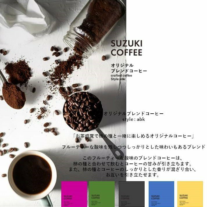 鈴木コーヒーオリジナルブレンド 【stye:abk】「お茶感覚で柿の種と一緒に楽しめるオリジナルコーヒー」フルーティーな酸味を残しつつしっかりとした味わいもあるブレンドです。