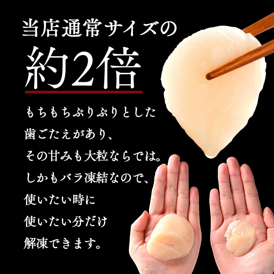 2022/06/06 10:00~2022/06/13 09:59 100円OFFクーポン配布→こちら特大ホタテ貝柱(冷凍)荷姿:真空パック原材料:商品ラベルに記載 ※お召し上がり方 品質には万全を期していますが極稀に貝が噛んだ砂が混じっていることがございます。