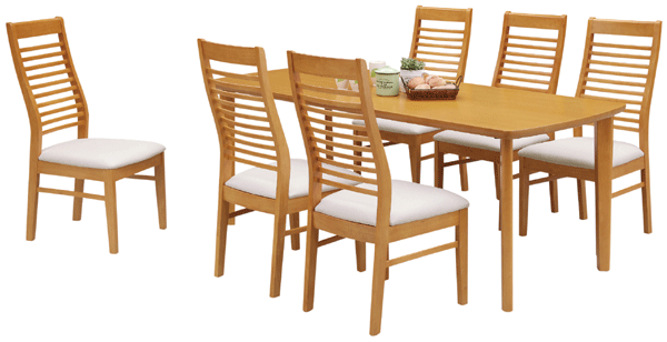 ) 材質 突板・ラバーウッド無垢座面・PVC・ラッカー塗装 カラー ナチュラル・ブラウン サイズ テーブル:幅180cmx奥行80cmx高さ70cmチェアー:幅45cmx奥行56cmx高さ98(43)cm その他 輸入品/簡単組立 配達はすべて宅配便(一人)で玄関渡しとなります。