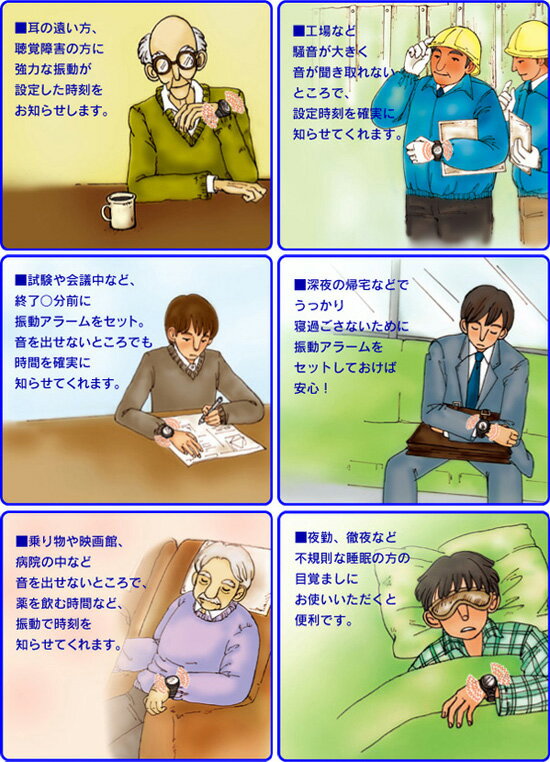 無音強振動によるアラームが周囲に知れることなく確実に時刻を伝えてくれるため、パブリック環境やビジネスシーンでも他人に迷惑が及ぶことがありません!また、騒音の大きな作業現場での使用や耳の遠い方にもおすすめです。