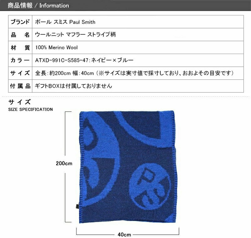 【ブランド】 Paul Smith ポールスミス 【品 名】 ウールニット マフラー ストライプ柄 【カ ラ ー】 ATXD-991C-S585-47:ネイビー×ブルー 【サ イ ズ】 全長:約200cm 幅:40cm ※サイズは実寸値で採寸しており、おおよその目安です 【材 質】 100% Merino Wool 【生産国】 中国製 【付 属 品】 ギフトBOXは付属しておりません 【商品説明】 イギリスの伝統的なスタイルに遊び心とひねりを加えた、イギリス発祥のチャーミングなブランド 【注意事項】 汚れありやタグなどの付属品不足は返品承れませんのでご注意ください 母の日、父の日、敬老の日、誕生日、成人の日、ブライダル、バレンタインデー、ホワイトデー、クリスマス、記念日、お中元、お歳暮、正月、先生・上司へのプレゼント。
