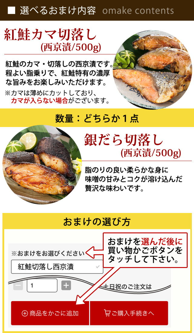 人気の定番魚・サワラや紅鮭に加え、選べる大容量おまけが付いた西京漬と粕漬のお買得セットです。