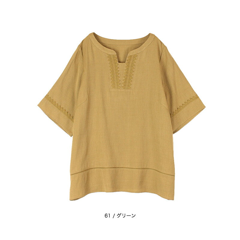 着用シーン:きれいめカジュアルコーディネート 旅行 お出掛け 買い物 普段着 女子会 食事会 仕事 カジュアルデート おうちコーデ おうち時間 学校行事【デザイナーからのメッセージ】夏らしい麻調スラブ素材のため、実際の麻よりも落ち感のある半袖ブラウスです。