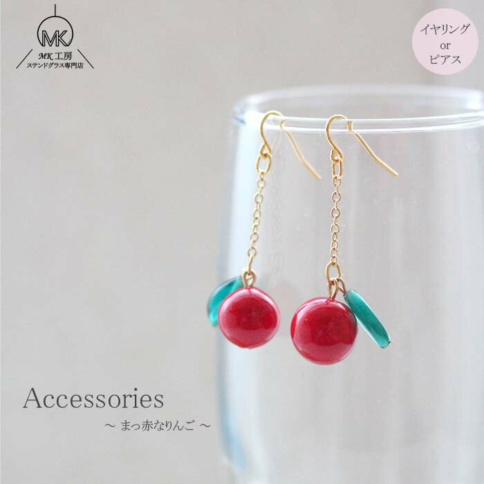 りんご まっ赤 フルーツ 赤 ガラス イヤリング ピアス アクセサリー ガラス細工 フルーツアクセサリー ロングピアス かわいい 手作り プレゼント ギフト ハンドメイド ステンドグラス 雑貨 作家