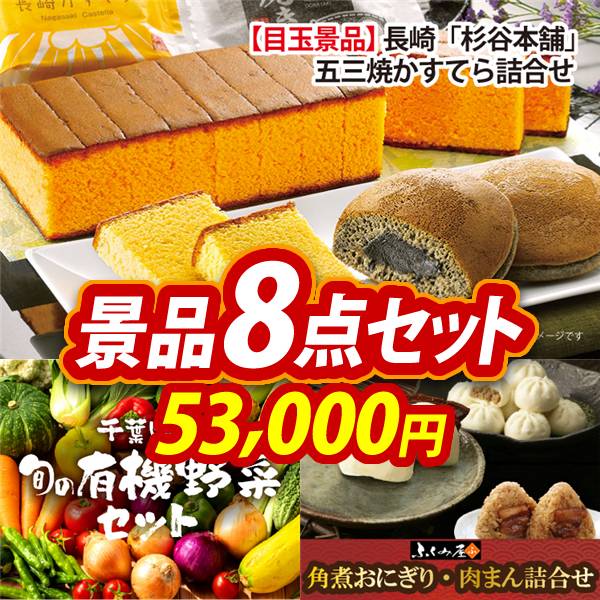 景品セット情報販売価格53,000円(送料・パネル代・税 全て込み)セット内容景品8点/A3景品パネル8点/目録風お申し込み用紙/ビンゴゲーム機/ビンゴカード/二次会虎の巻景品お届け形態数量沖縄 ソーキそばパネル&目録1熊本 千興ファーム 馬刺しセットパネル&目録1佐賀県名物 彩色いかしゅうまいパネル&目録1長崎 「杉谷本舗」五三焼かすてら詰合せパネル&目録1大分 真鯛とぶりの海鮮漬丼パネル&目録1鹿児島県産 黒豚ロース味噌漬けパネル&目録1宮崎名物 チーズ饅頭20個入りパネル&目録1福岡「かねふく」無着色からし明太子パネル&目録1合計8